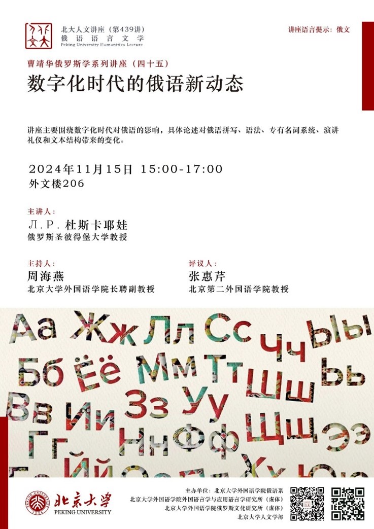 2024年11月15日下午,俄罗斯圣彼得堡国立大学杜斯卡耶娃教授(Л.Р. Дускаева)应邀在乐动在线中国官方网站外文楼206会议室进行讲座,主题为“数字化时代的俄语新动态”。本次讲座系“北京大学人文讲座”第439讲暨“曹靖华俄罗斯学系列讲座”第45讲,由乐动在线中国官方网站俄语系、外国语言学及应用语言学研究所(虚体)、俄罗斯文化研究所(虚体)和北京大学人文学部主办。