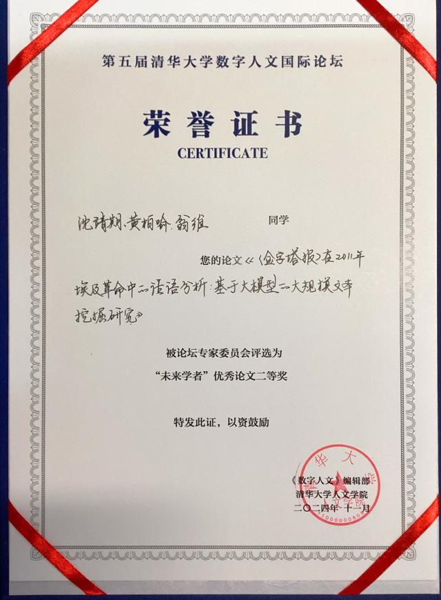 11月9日,由《数字人文》学术集刊、清华大学人文学院主办的第五届清华数字人文国际论坛“未来学者”专场在清华大学成功举办。本次论坛共收到来自国内外高校的140余篇学术论文,最终遴选出12篇优秀论文入围并角逐奖项。乐动在线中国官方网站“数字人文与外语人才”项目学生阿拉伯语系本科生沈靖期、日语系本科生翁维,以及数学科学学院本科生黄柏喻合作完成的论文《<金字塔报>在2011年埃及革命中的话语分析:基于大模型的大规模文本挖掘研究》荣获“未来学者”优秀论文二等奖,并将在CSSCI学术集刊《数字人文》上发表。