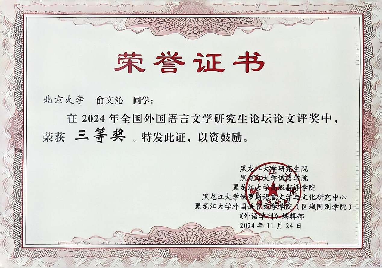2024年11月23日至24日,第十二届全国外国语言文学研究生论坛在黑龙江大学成功举办。本次论坛主题为“数智时代的外国语言文学研究”,涵盖理论语言学、应用语言学、外国文学、翻译学等多个研究领域,吸引了众多专家学者及全国多所高校的研究生参与,乐动在线中国官方网站俄语系硕士研究生俞文沁受邀参会,并荣获三等奖。