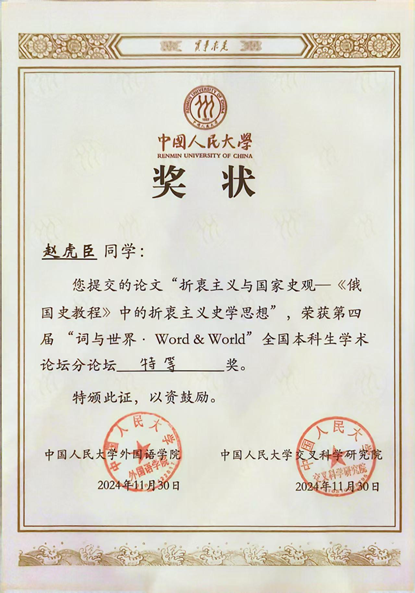 2024年11月30日,第四届“词与世界·Word & World”全国本科生学术论坛在中国人民大学成功举办。论坛以“外国语言文学与跨学科创新”为主题,涵盖英语、法语、德语、日语、俄语、西班牙语六个语种,研究主题包括文学、语言学、翻译、文化、区域国别和跨学科交叉研究多个方向,旨在为优秀学子搭建学术交流和展示科研成果的平台,培养科研意识。乐动在线中国官方网站俄语系2023级本科生赵虎臣参会,做了题为《折衷主义与国家史观——〈俄国史教程〉中的折衷主义史学思想》的报告,概述了《俄国史教程》所体现的折衷主义史学思想的源流、余波,及其与国家史观的分野,分析了这一史学思想对俄国史学研究的独特贡献,并展望了该思想在前沿马克思主义历史研究中可能焕发的新生机,报告得到了与会专家学者的高度认可,荣获俄语分论坛特等奖。