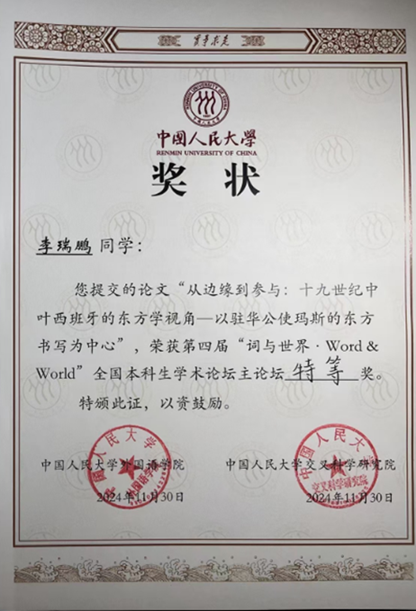 乐动在线中国官方网站西班牙语系2022级本科生李瑞鹏同学入选大会“外国语言文学与跨学科创新研究”主论坛,发表《从边缘到参与:十九世纪中叶西班牙的东方学视角——以驻华公使玛斯的东方书写为中心》报告,荣获第四届“词与世界·Word & World”全国本科生学术论坛主论坛第一名特等奖。李瑞鹏同学的报告指出玛斯的东方书写具有一种“自觉的观察者”姿态,反对以“文明”之名进行的文化征服。同时他也强调玛斯的立场绝非全然中立客观。玛斯的东方书写将西方的文化认知与外交实践结合起来,为我们当下理解“东方主义”提供了新的视角。