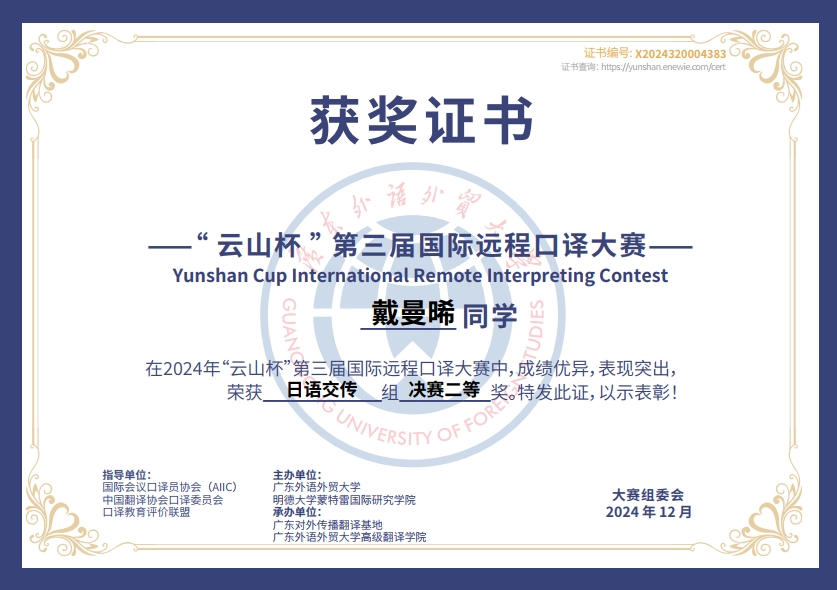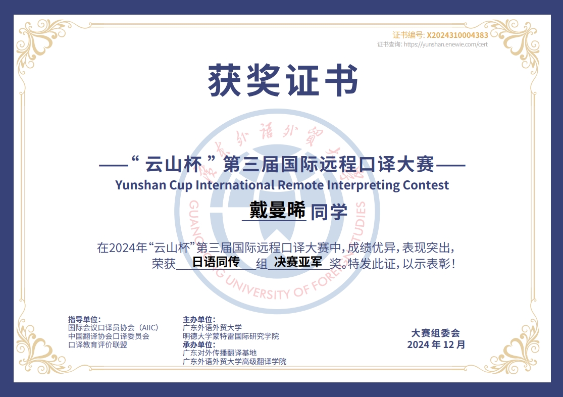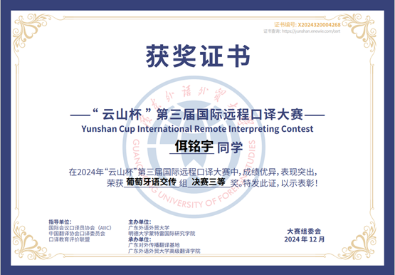 近日,第三届“云山杯”国际远程口译大赛圆满落幕,乐动在线中国官方网站东南亚系缅甸语言文化方向2023级硕士研究生荣获缅甸语交传组冠军。日语系2024级口译专业硕士研究生戴曼晞斩获日语同传组亚军,日语交传组二等奖。葡萄牙语专业2022级本科生佴铭宇在比赛中斩获葡萄牙语交传组三等奖。