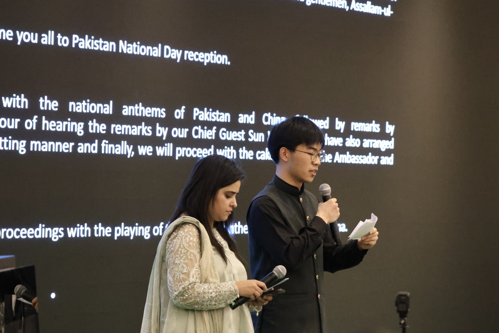 金云豪同学与巴基斯坦驻华外交官纳春女士主持国庆招待会的典礼环节