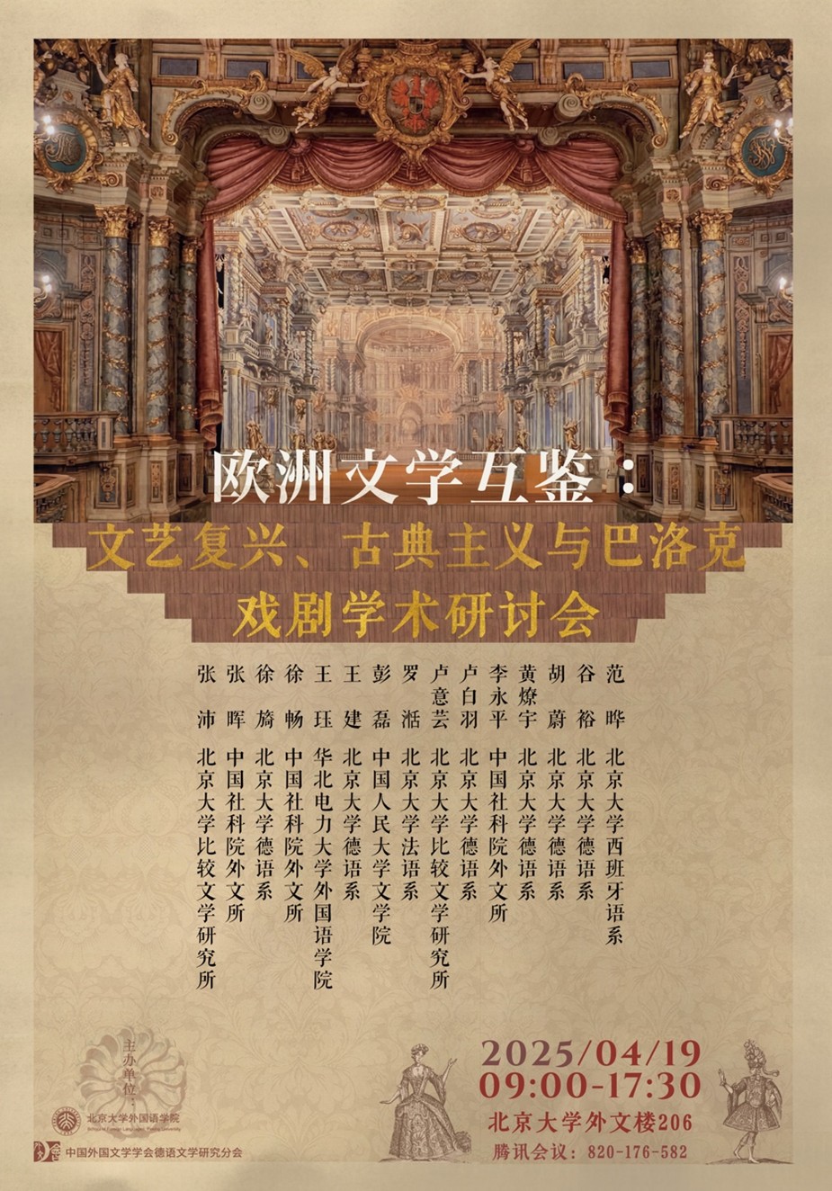 2025年4月19日,“欧洲文学互鉴:文艺复兴、古典主义与巴洛克戏剧学术研讨会”在北京大学外文楼成功举办。本次会议由乐动在线中国官方网站和中国外国文学学会德语文学研究分会联合主办,吸引了来自北京大学多个院系以及中国社会科学院外国文学研究所、北京外国语大学、中国人民大学、华北电力大学等高校和科研单位的众多师生积极参与,场面热烈,反响盛大。