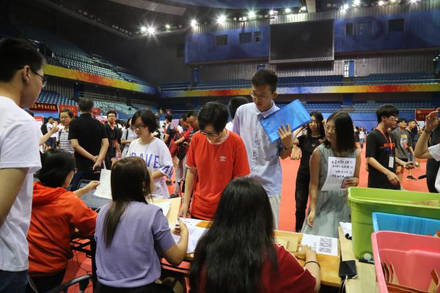 上午6:15,天刚蒙蒙亮,在学院师生共同努力下,温馨而有序的外院迎新接待站布置完毕。外国语学院副院长付志明、党委副书记王恒、教务办公室和学生工作办公室的老师以及学生志愿者们,在邱德拔体育馆内的本科生外院迎新接待站等待着新同学们的到来。