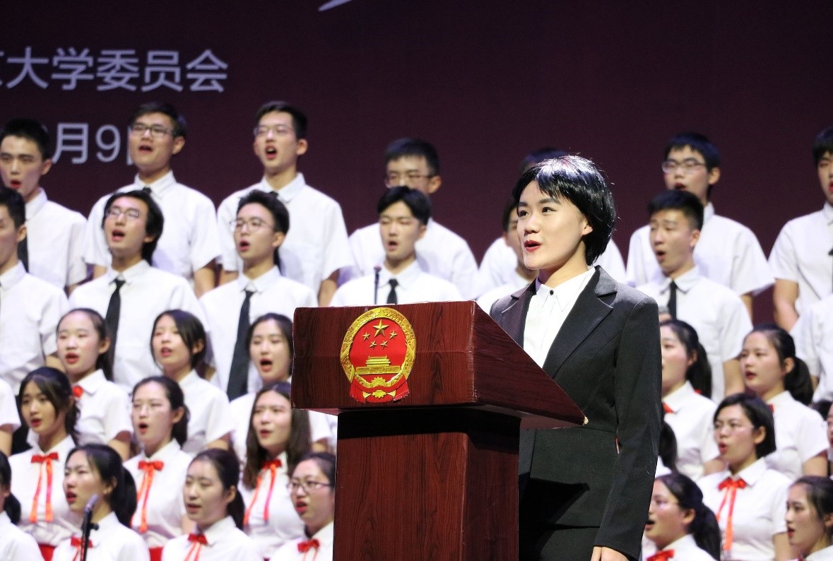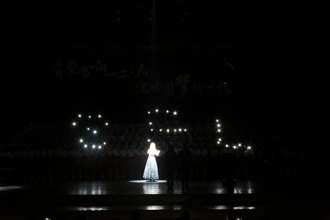 台上的表演激动人心,幕后的付出令人动容。今年在准备时间紧张的前提下,外国语学院各方都提供了大力支持,在排练安排、道具准备、指挥配乐、慰问物资等方面保驾护航。外院除170余名本科新生登台合唱外,还征集了50余名责任心强,具有组织经验、才艺特长的学生志愿者形成舞台剧组、视频组和后勤组。从金秋到寒冬,从动员大会到登台演出,从分声部、识谱到最终合排成型,组织团队、排练团队和表演团队全情投入、各司其职、各尽其能,在不同的岗位上付出宝贵心力、挥洒青春汗水、凝聚集体智慧。