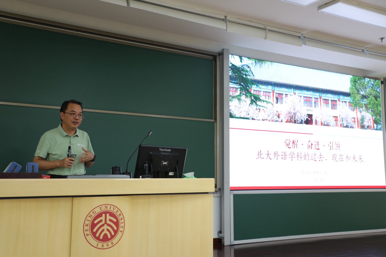 2025年9月3日下午,外国语学院院长陈明教授在理科教学楼107教室,为学院2025级本科生与研究生讲授开学第一课。开学第一课围绕北大外语学科的过去、现在和未来,全景式呈现学科建设与院史院情。院党委副书记冯美娜、团委书记伍昕钰及新生辅导员李龙盛共同参与学习。