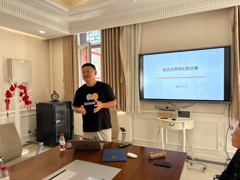 董峰系友从自身工作经历出发,分享了关于互联网行业和AI领域的思考与总结,并强调全球化背景下外语能力日益凸出的重要作用。董峰寄语学弟学妹,面对百年未有之大变局,机遇与挑战并存,北大学子当高歌猛进,做时代的领头羊。