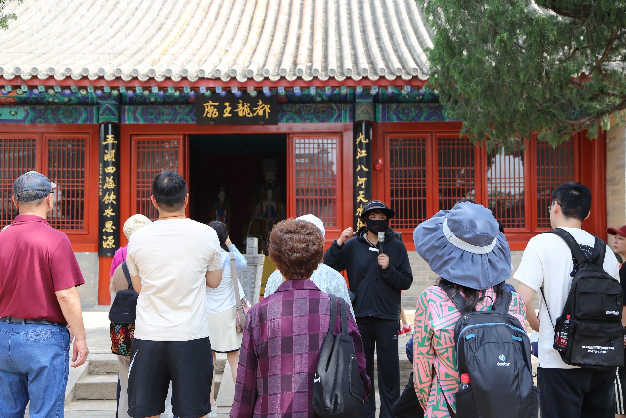 随后,老师们参观了都龙王庙,此庙特别之处在于其名字里的“都”字,意为“总管”之意,因此也号称“都管天下龙王之庙”,这里不仅供奉着龙王,东西两个配殿中还供奉着财神与药王,寄托着古人的美好愿望。正殿东西山墙上保留了清朝末年至民国初年绘制的讲述久旱求水的“找水记”壁画。后院数座历史悠久的石碑碑文上可以看出古人对水利的重视。