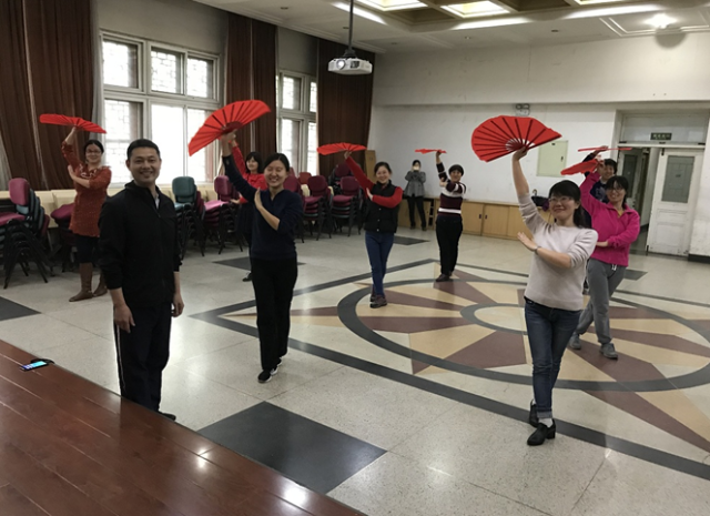 据悉,老师们的练习场所——民主楼二楼会议厅正是解放前燕京大学的小教堂(chapel)。每当怡情怡性,悠远绵长的太极扇音乐响起时,在这里练习,更觉意境深远,韵味十足。