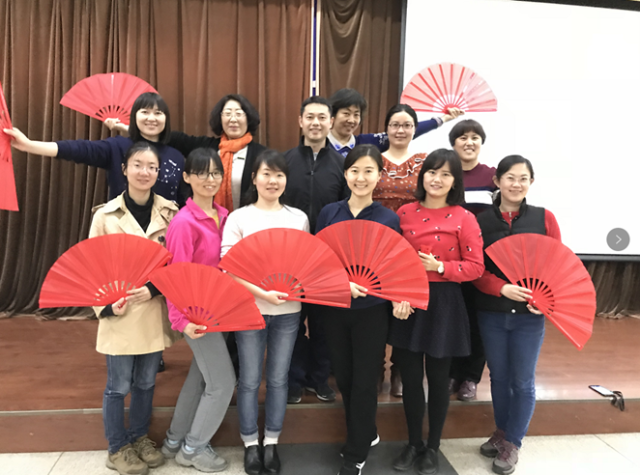 在这样一派生机盎然的景象中,外国语学院的老师们拉开了学习“未名太极扇”的序幕。每天上午,老师们都会齐聚民主楼会议厅,认真练习、反复琢磨。个个挥洒自如,将太极含蓄内敛、连绵不断、以柔克刚、急缓相间、行云流水的拳术风格淋漓尽致地展现在大家眼前。