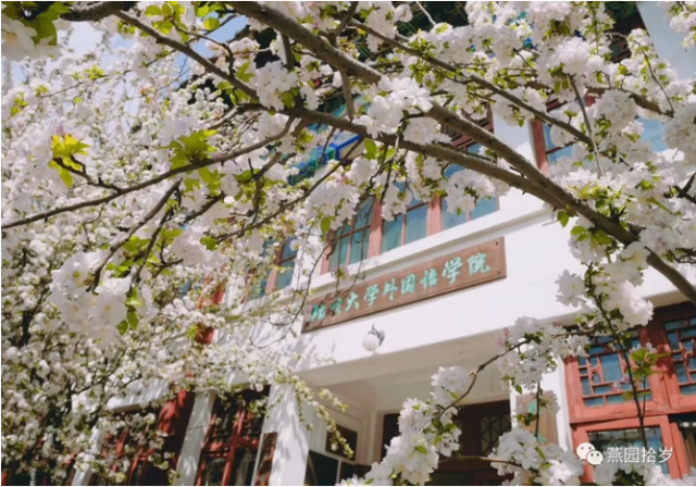 这六棵海棠生得高大,与外文楼齐眉。左右各三棵,将“外国语学院”的木匾拱月般地簇拥,更显出这座悠久的校园深沉的学术底蕴。海棠春景,不仅是美得令人赞叹不绝,更是因其所在的这栋古建筑,因其所在的燕园,而愈发神圣光辉。