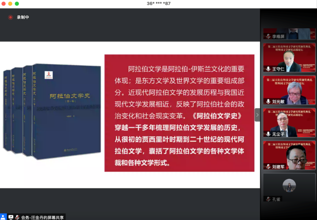 王佐良外国文学高等研究院院长、评奖委员会主席金莉教授介绍了评选工作的开展情况,60名初评专家选出了16部作品进入第二轮评选,最终8部作品进入终评,第三轮的终评专家又经过三轮投票最终确定获奖名单。仲跻昆教授撰写的《阿拉伯文学史》摘得本届大奖的桂冠。