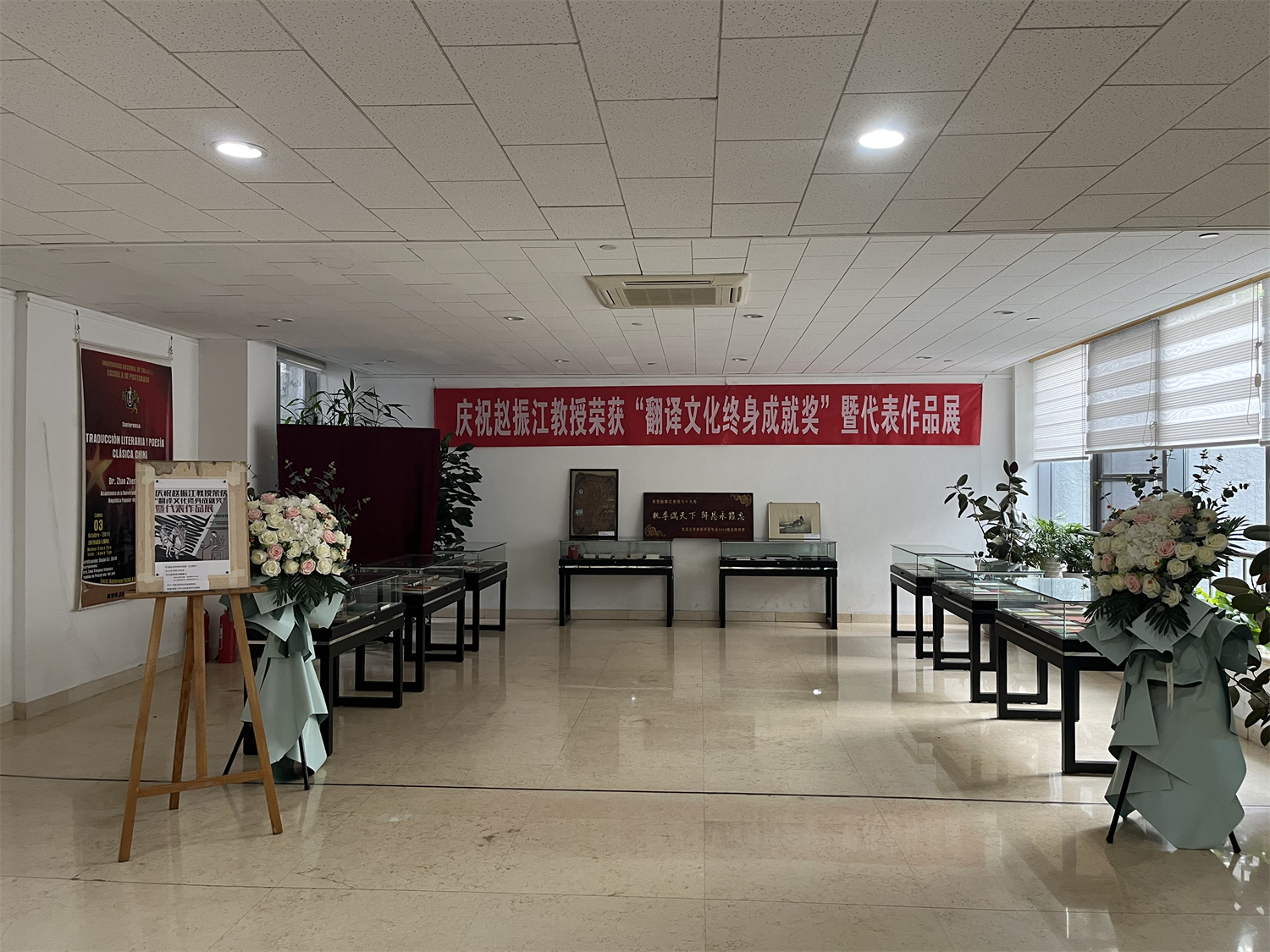 赵振江教授代表作品展由西葡意语系和北京大学图书馆外国语学院分馆共同筹办,即日起在外国语学院新楼分馆开放参观。西班牙语专业精选了赵老师代表作品80余种陈列,介绍“人民诗歌的翻译家”赵振江老师在中西新诗翻译上的卓越贡献:他把《红楼梦》带进西班牙语世界;他让米斯特拉尔、希梅内斯、聂鲁达、帕斯、加西亚·洛尔卡等西语文学大师用中文“说话”,精确“传达了诗人的激情和幻想,做到了形似和神似的平衡”,为中国诗歌读者和创作者带来了全新阅读体验;他“在整个诗歌翻译界享有极高声誉”,乃至没有赵振江老师的翻译“我们对西班牙语诗歌就无法建立起一个基本的观念”;他不问收获,只求耕耘,“不仅仅是一位翻译家,还是把自己的言说变成行动和现实的人。”