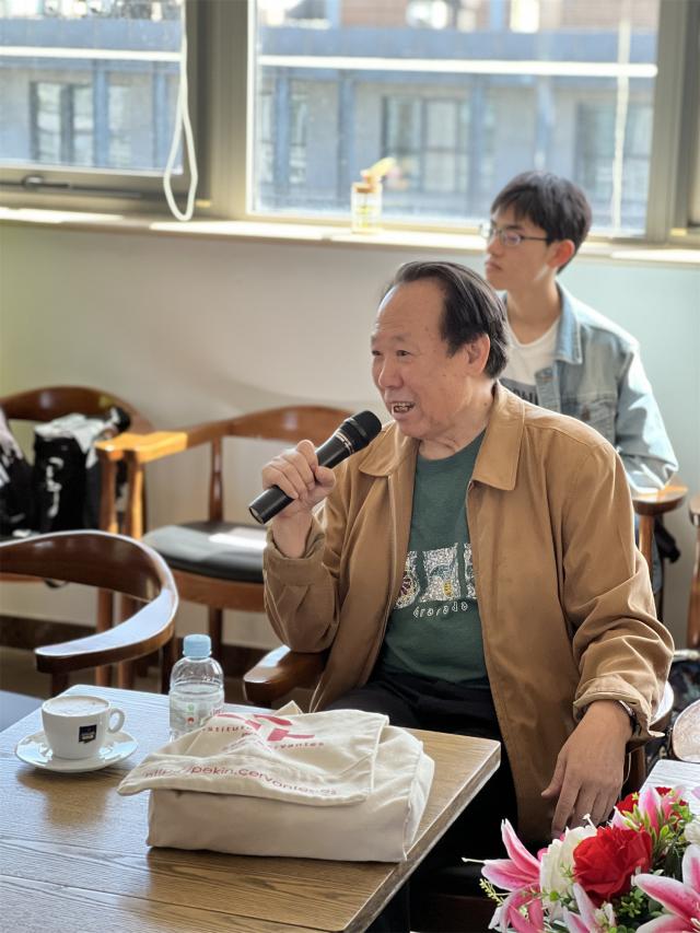 随后,在外国语学院咖啡书苑,赵振江老师与师生们座谈,分享自己的翻译生涯与感悟。他说这是一个难得的机会,让他能对自己的翻译生涯做一个简单的梳理和回顾。现场放映的一张张图片承载着宝贵的回忆,赵老师生动地讲述了七十年代末八十年代初在墨西哥进修的生活、八十年代末在西班牙格拉纳达大学翻译《红楼梦》时艰苦的工作,以及1995年获得智利鲁文·达里奥“蓝色百年”奖时独特的经历等。赵老师回忆道,为翻译《红楼梦》,他和两位西班牙译者加班加点工作,甚至连周末和圣诞节都没有休息。他翻译阿根廷高乔史诗《马丁·菲耶罗》是纯粹出于兴趣,出于对诗歌的热爱,并未考虑过刊印发行。在时代风云中,它的出版成为了文化外交大事,促进了中阿两国人民相互了解和交流。有阿根廷出版社为赵振江教授印制了《马丁·菲耶罗》专属版。世上仅此一本,独一无二。赵老师娓娓道来,幽默风趣,在座师生如沐春风,不时发出会心的笑声。