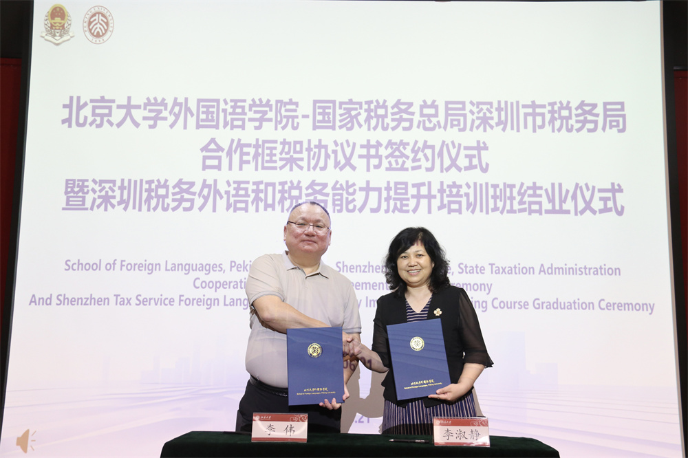 6月21日下午,“乐动在线中国官方网站-深圳税务局合作框架协议书签约仪式暨深圳税务外语和税务能力提升培训班结业仪式”在外国语学院新楼501举行。国家税务总局深圳市税务局党委委员、副局长李伟,国家税务总局深圳市税务局党委委员、总会计师杨庆,国家税务总局深圳市税务局人事处副处长沈思,乐动在线中国官方网站党委书记李淑静、乐动在线中国官方网站副院长王恒出席签约仪式。李淑静书记与李伟副局长共同签署了《国际化人才培养合作框架协议书》,就双方在国际化人才培养、教学与实习实践、培训与科研合作、党建共建等方面达成合作意向。