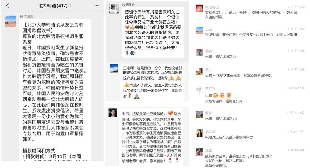 乐动在线中国官方网站韩语系系友会会长、86级系友王坚在发起捐款时表示,“守望相助,共克时艰!希望各位系友一起献上爱心,韩国人民加油!”乐动在线中国官方网站副院长、韩语系主任王丹教授为广大师生体现出的善意深深感动,“韩国,对我们每个人而言都有着不同寻常的记忆,我们所有学生自入学之日起,就与韩国结下了不解之缘。作为韩语学习者,韩国疫情形势和韩国人民的安危时时刻刻牵动着我们的心。这次,我们一起献上我们的爱心,希望能给韩国人民带去爱与希望。希望他们能够拥有更安全的学习环境,更希望他们和所有韩国人民能够早日摘下口罩,露出灿烂的笑脸。”武汉籍系友严格表示,“感谢系里组织本次活动,可以有途径向韩国朋友捐款。只是我的一点心意,代表不了武汉,全国人民对武汉的情意我们一定记住的。”在校博士生于美灵说到:“这次倡议,让我们北大学子可以为韩国抗疫贡献一份力量。真心希望韩国疫情早日好转,也希望世界疫情早日结束。”