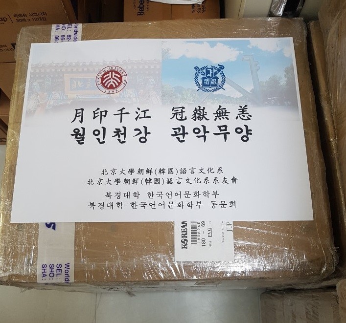 由于物流不畅、通关手续复杂,口罩迟迟难以抵达,双方的师生焦急万分,多次通过电话、邮件等方式就物资进度进行了沟通。在中韩双方的共同努力下,4月28日,在仁川海关停留35天的2.4万只口罩终于抵达韩国国立首尔大学。当天下午,我驻韩大使馆公使衔参赞方坤、公报官覃晓逵、韩国首尔科学综合大学院大学教授黄菲、首尔大学博士研究生张磊等几位在韩系友前往首尔大学参加了捐赠仪式。捐赠仪式上,首尔大学学生处处长郑效志教授受首尔大学吴世正校长委托向韩语系全体师生及系友赠送感谢牌,她表示:“感谢韩语系将这批宝贵的抗疫物资捐赠给首尔大学,为我们抗击疫情工作带来了莫大的支持。北京大学与首尔大学自1993年开展学术交流,2001年签署学生交换协议,一直以来双方开展了活跃的交流活动。我相信此次守望相助的捐赠活动可以成为两校发展的新契机,我也相信在中韩两国的共同努力下,双方一定能战胜疫情。”