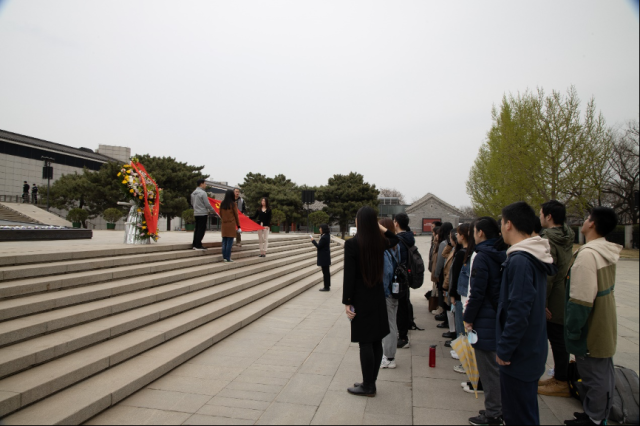 随后,在中国人民抗日战争纪念馆副馆长董立新和外国语学院院友吕曦的带领下,师生来到抗战馆进行实地学习。清明时节寄哀思,在董馆长的指引下,师生在独立自由勋章雕塑前向先烈默哀致敬。董馆长表示,在建党一百年的关键历史节点,我们当代中华儿女应当“缅怀英烈志 奋进新征程 ”, 在缅怀先烈、寄托哀思的同时,更应当砥砺奋进,在新的一百年中创造新的辉煌。