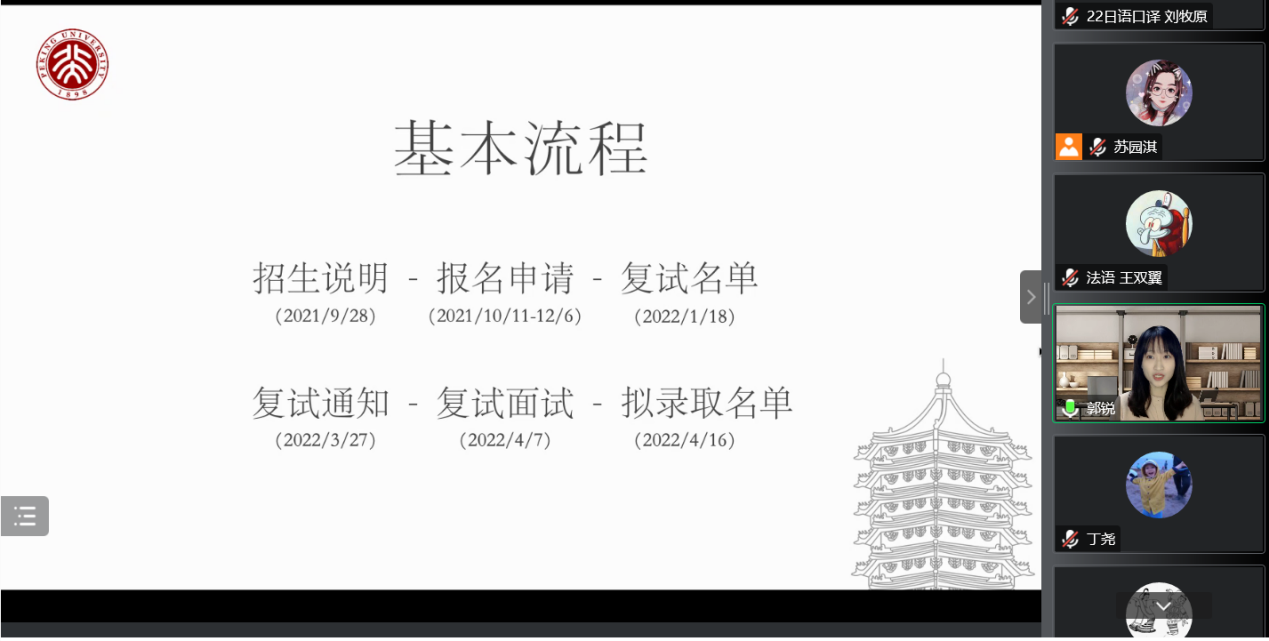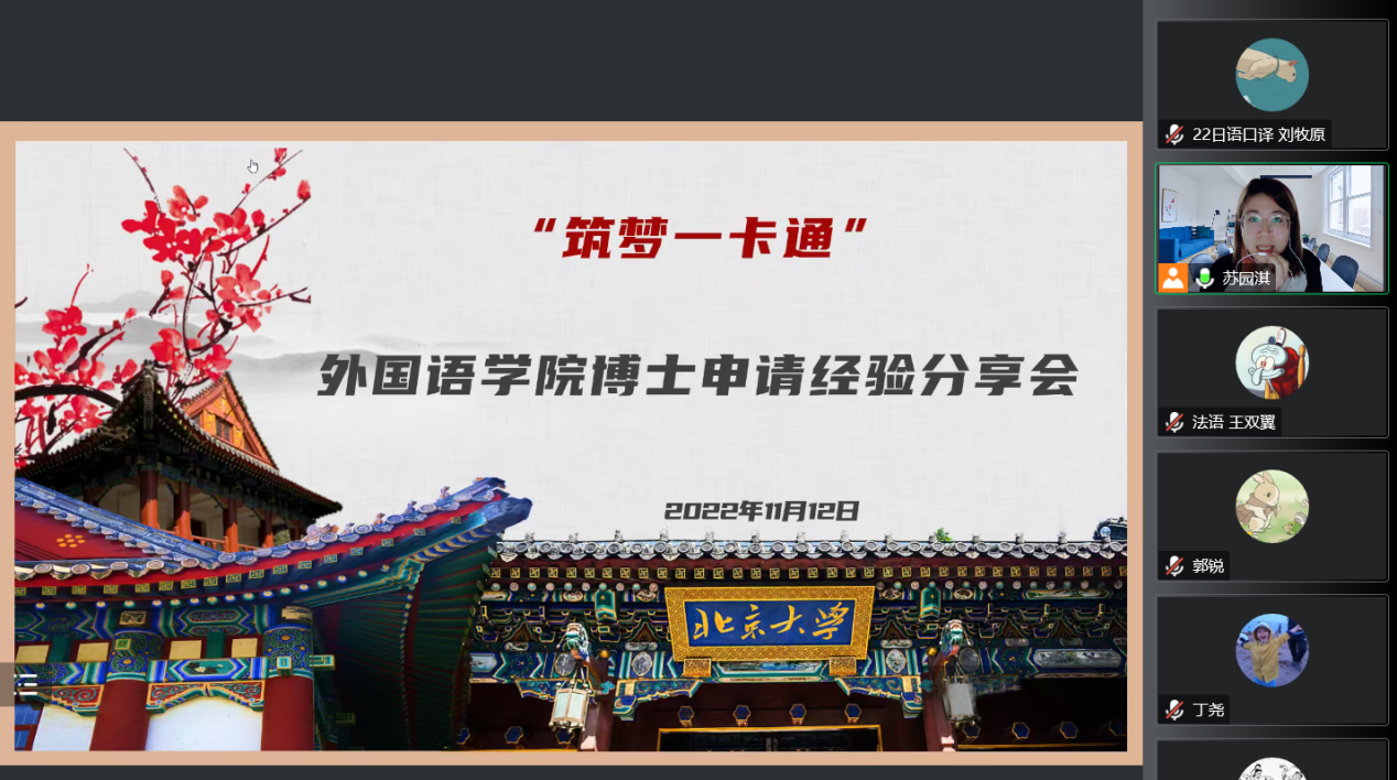 为满足同学们深入了解博士申请流程的实际需求,帮助有志于继续深造的同学们做好相关规划,乐动在线中国官方网站研究生会就业部于11月12日晚以线上形式顺利举办“薪火相传,朋辈引领”博士申请经验分享会,外国语学院党委副书记王恒、团委书记伍昕钰、辅导员丁尧出席活动。