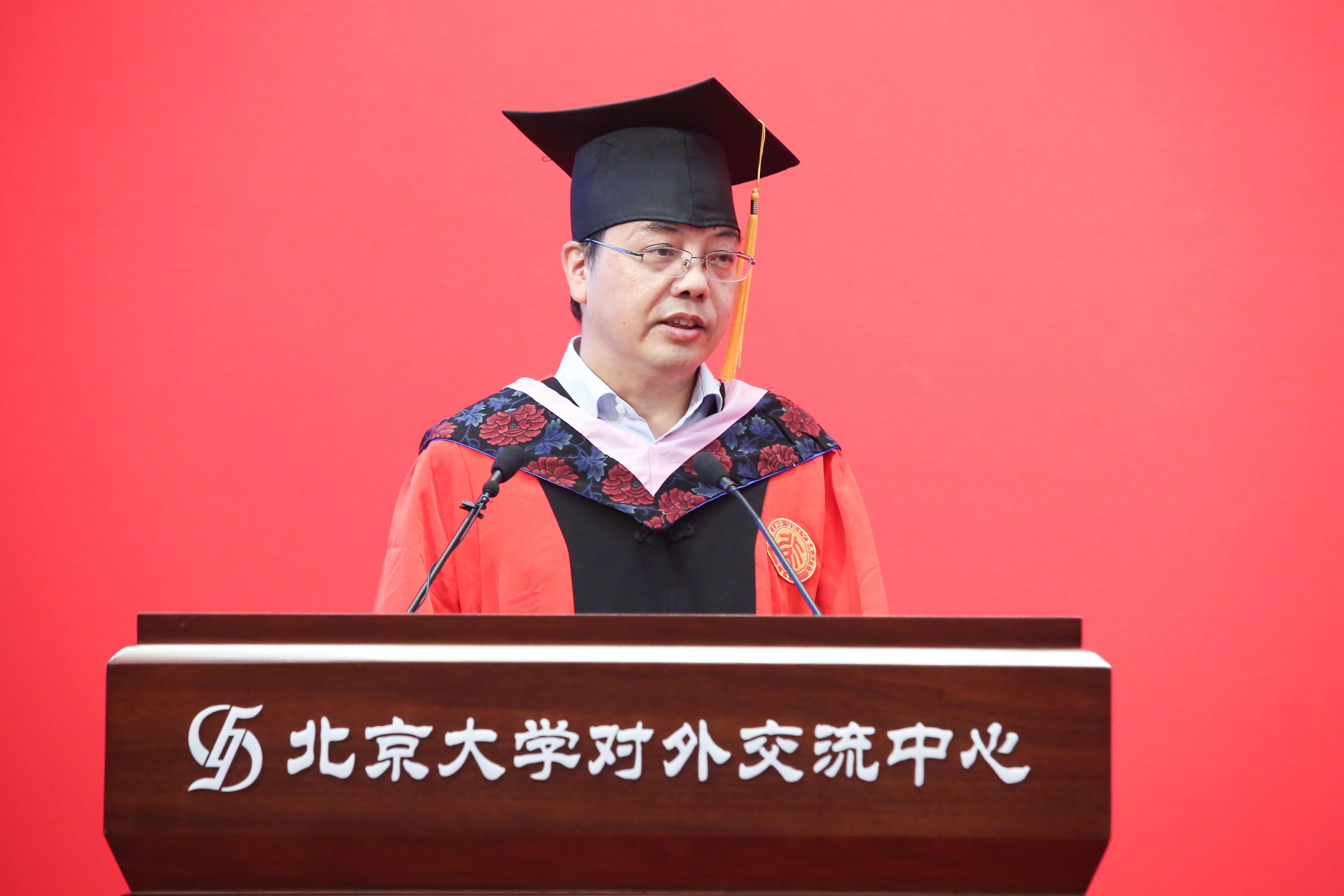 离别之际,师生情深,谆谆教诲,铭记于心。在热烈的掌声中,院长陈明为全体本科生毕业生送上深情寄语。他回顾了四载燕园生活的酸甜苦辣,同学们在语言的学习中遇到诸多挑战,但收获的却是克服困难的喜悦,是在文字背后对人类历史的感悟,是在语言基础上文化交流、文明互鉴的担当。从抗疫多语种语料库,到走遍学校、福利院和祖国各地的志愿服务,再到活跃在冬奥会各个场馆的“冰新一代”,一批批外院人用自己的足迹和汗水践行了心怀天下的责任与使命。陈明院长将季羡林先生的:“志当存高远,心不外平常”赠予同学们,殷切嘱托同学们要以平常心处世,脚踏实地、不忘初心,不论身在何地都要坦坦荡荡、淡然平和。也要志存高远,牢记北大与时代同呼吸、共命运的光荣传统,不忘外院的治学精神、探索精神和奉献精神,以语言为舟,架起文化沟通的桥梁,用外语丈量世界。最后陈明教诲同学们,人生应当常怀感恩和怀念。