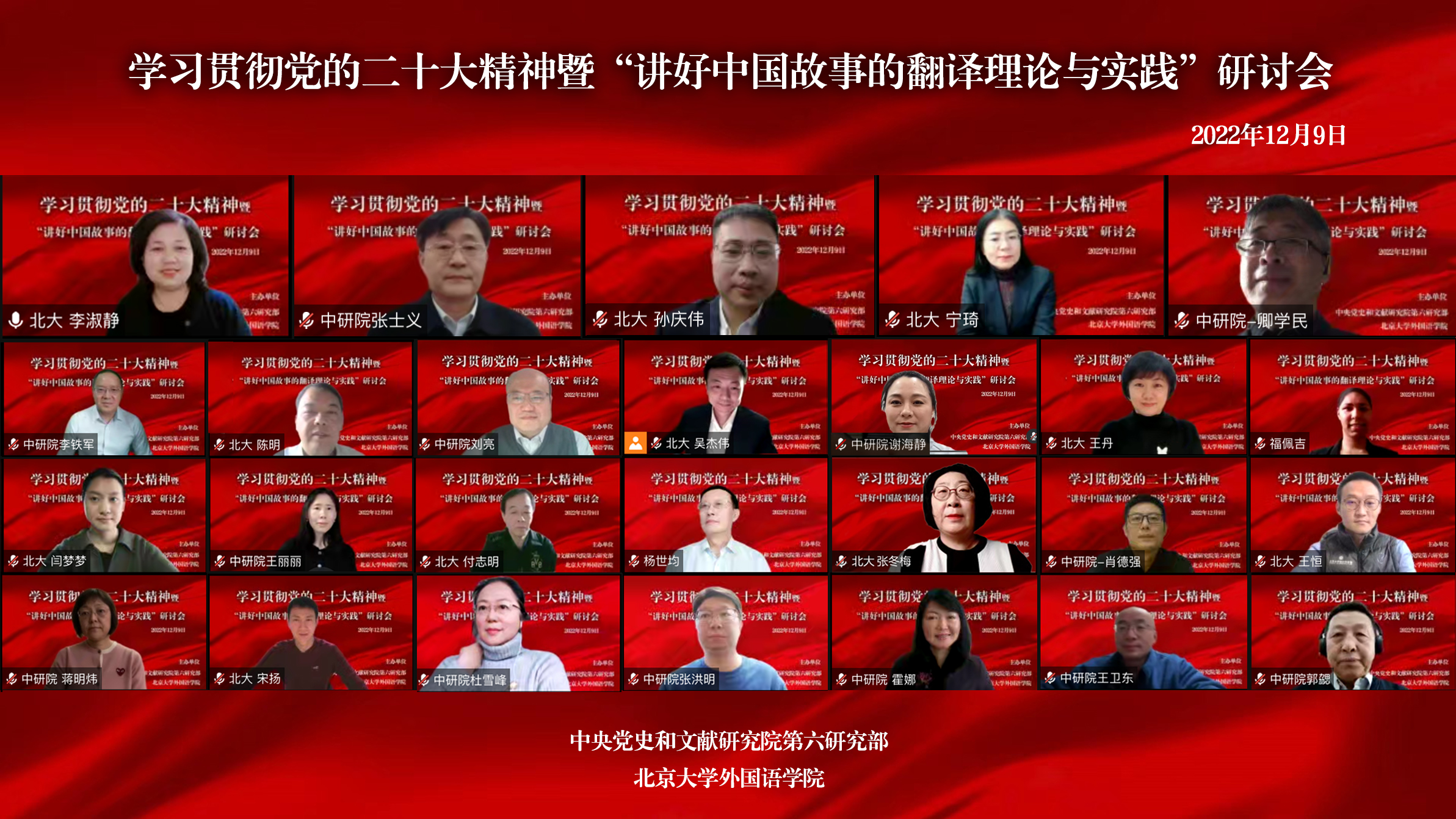 为深入学习贯彻党的二十大精神,加强国际传播能力建设和高端翻译人才培养,中央党史和文献研究院第六研究部与乐动在线中国官方网站联合举办了学习贯彻党的二十大精神暨“讲好中国故事的翻译理论与实践”研讨会。会议于12月9日下午在线上举行。中央党史和文献研究院第六研究部主任张士义,北京大学党委常委、副校长孙庆伟,北京大学党委副书记、副校长宁琦,乐动在线中国官方网站院长陈明等出席会议。乐动在线中国官方网站党委书记李淑静主持开幕式。中央党史和文献研究院第六研究部全体在职人员和外国专家、乐动在线中国官方网站师生共160余人相聚云端。