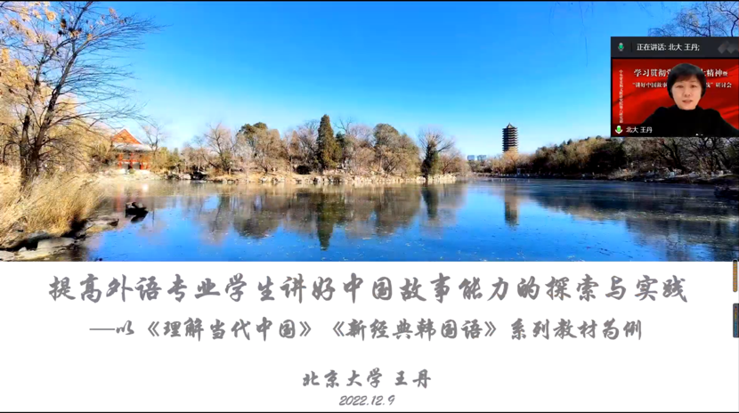 乐动在线中国官方网站副院长、朝(韩)语系教授王丹从教材编写角度分享了个人的育人理念与心得体会。她认为加强国际传播能力建设具有重大现实意义,在此背景下,必须着力提高外语专业学生讲好中国故事的能力。外语教材建设的重要性与可行性被进一步凸显。王丹通过介绍《理解当代中国》系列教材、《新经典韩国语》系列教材的编写工作,生动地展示了将中国故事融入外语教材的基本原则、探索历程与实践路径。她希望外语专业教师能够以教材、课程为阵地,秉持全方位融入、全过程渗透,无处不育人、无处不思政的理念,实现价值引领、知识传授、能力培养相统一,将“讲好中国故事”理念落到实处,为提高学生“讲好中国故事”能力作出应有贡献。