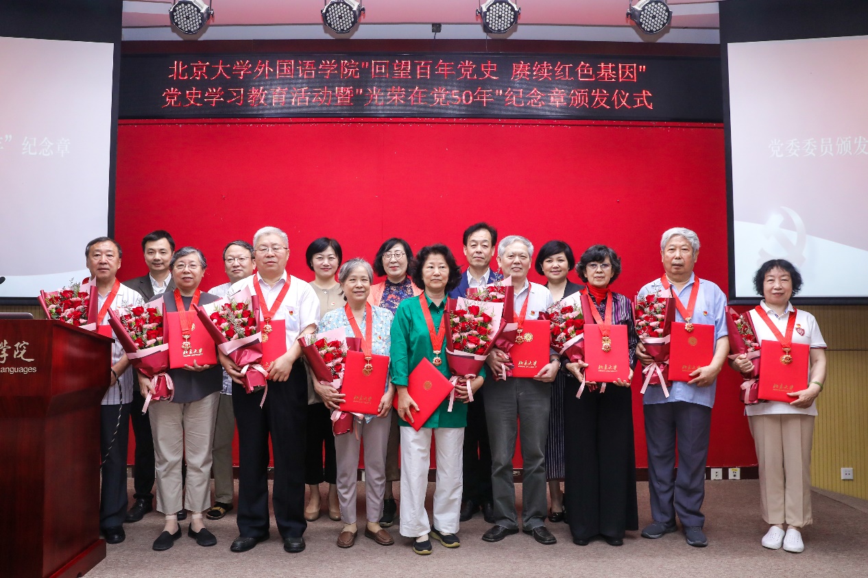 纪念章颁发仪式在庄严肃穆的国歌声中拉开序幕。外国语学院党委委员、副院长付志明代表学院党委宣读“光荣在党50年”党员名单。今年,外国语学院共有64名老党员获颁纪念章,其中年龄最大者96岁,党龄最长者达74年。外国语学院党委委员为老党员代表颁发“光荣在党50年”纪念章与致“光荣在党50年”老党员的一封信,青年党员教师代表向他们献花致敬。