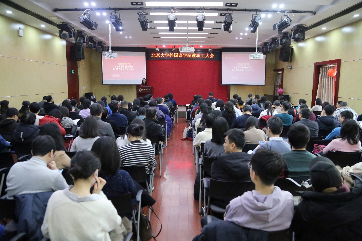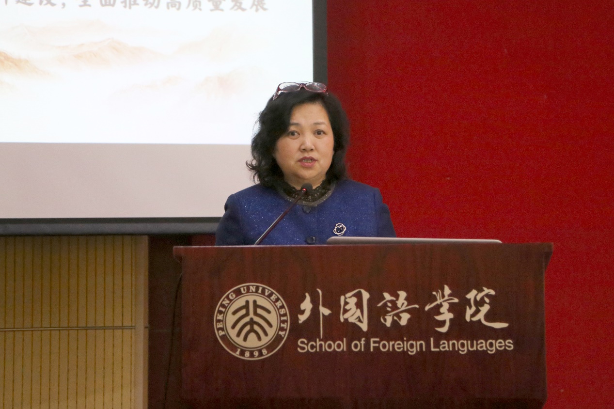 党委书记李淑静作党建工作报告。2023年,外院党委以习近平新时代中国特色社会主义思想为指导,持续学习贯彻党的二十大精神,积极服务一流学科建设,全面推动高质量发展。在主题教育工作中,以理论学习补足精神之钙,外院采用分层分类的推进方式,推动理论教育融在日常;以调查研究夯实谋事之基,下沉一线、解剖麻雀;以检视整改亮出决心之剑,直面问题、动真碰硬;以推动发展引领同行之路,为强化北京大学校地合作,提升外语学科推动中外教育、科研、文化、经贸等领域交流的整体水平贡献力量。
